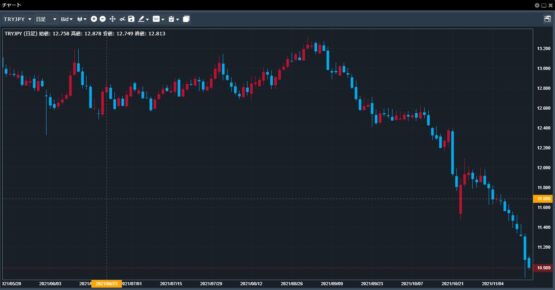 2021年11月17日現在。トルコリラ/円(TRY/JPY)の値下がりが止まりません。